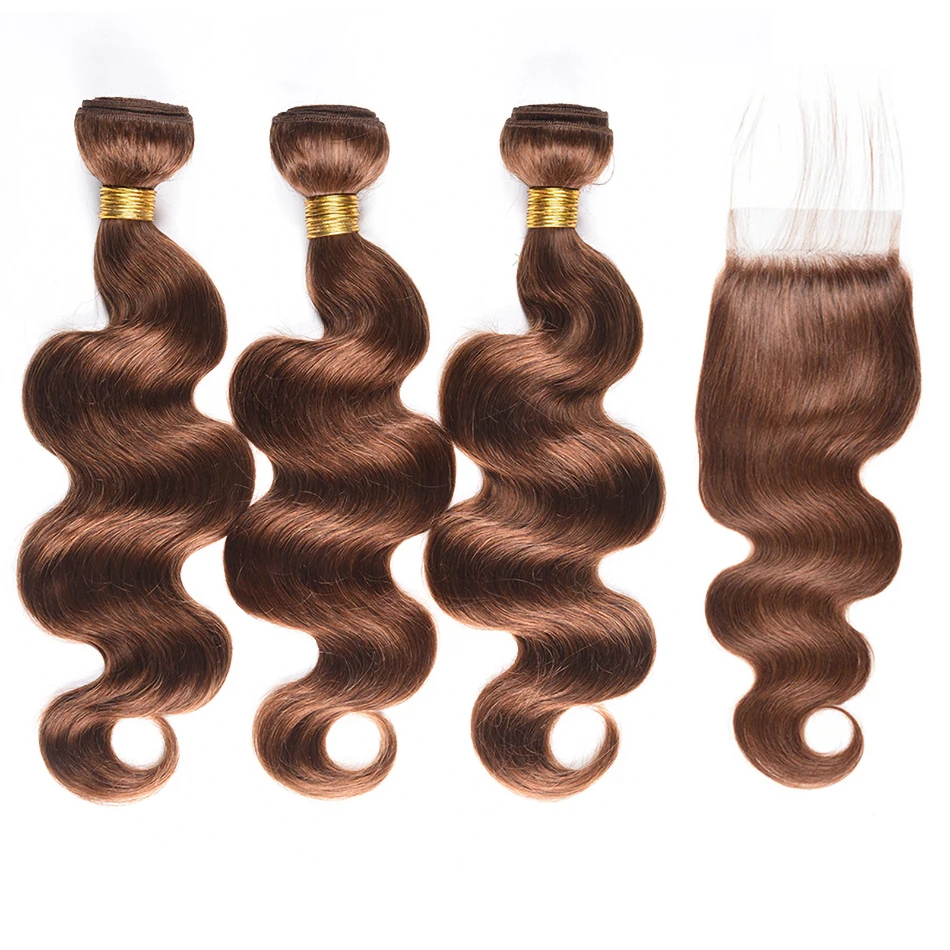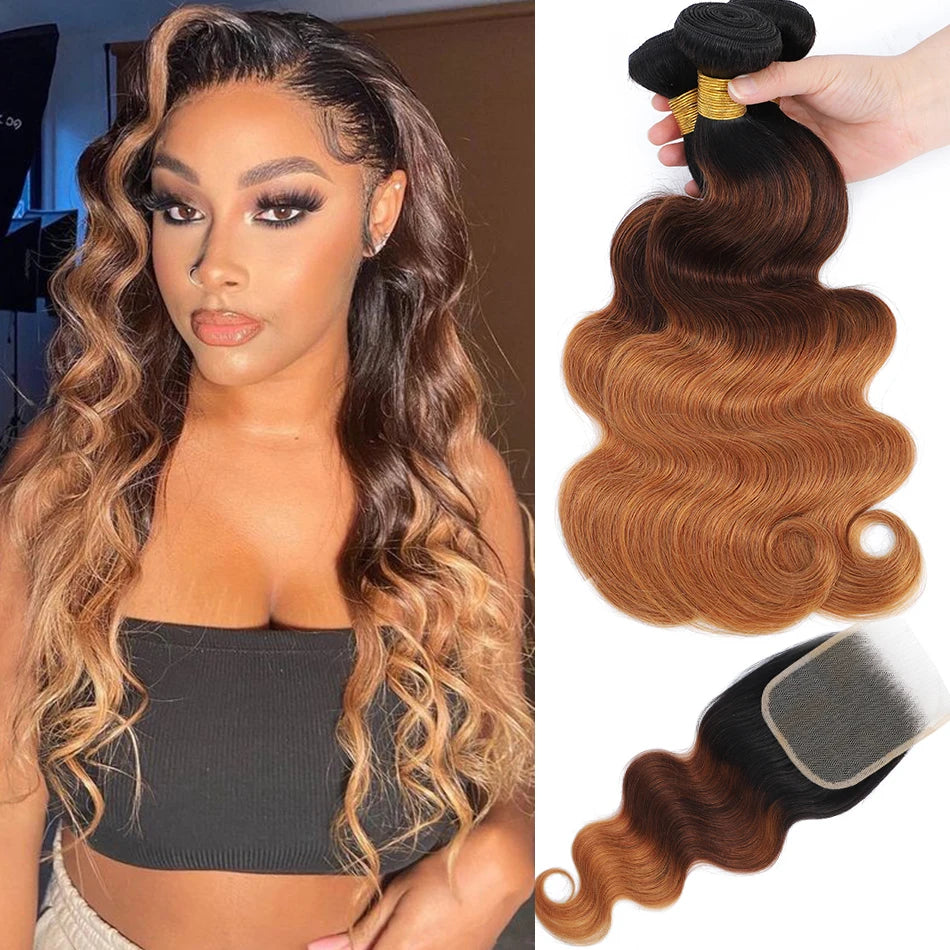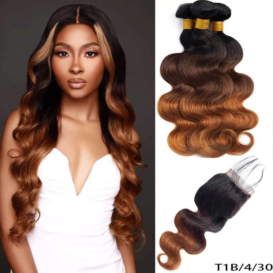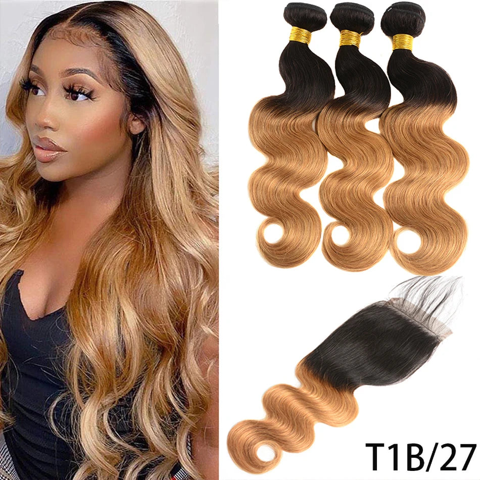 100% Human Hair Weave Bundles with Lace Closure Ombre Vietnames Hair Blond Brown Body Wave 3 Bundles With 4x4 HD Lace Closure